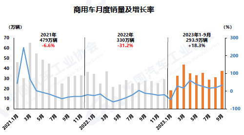 1-9月,商用車產(chǎn)銷累計(jì)完成290.7萬輛和293.9萬輛,同比分別增長19.8%和18.3%。在商用車主要品種中,與上年同期相比,客車、貨車產(chǎn)銷均呈兩位數(shù)較快增長。