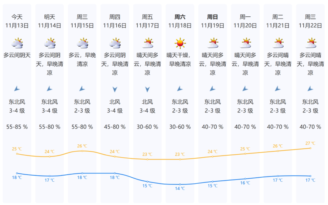 13-14日陰天到多云,氣溫進(jìn)一步下降,早晚清涼,沿海、高地和海區(qū)最大陣風(fēng)7-8級。