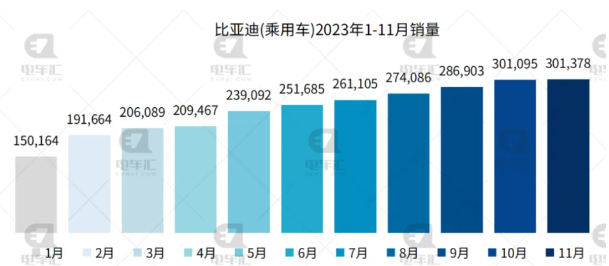比亞迪11月新能源乘用車銷量301,378輛,同比增長(zhǎng)31%,環(huán)比上月增加了283輛。1-11月累計(jì)銷量2,672,728輛,同比增長(zhǎng)65%。今年前11個(gè)月比亞迪集團(tuán)新能源汽車?yán)塾?jì)銷量268.3萬(wàn)輛,距離全年300萬(wàn)輛的目標(biāo)還有近32萬(wàn)輛。