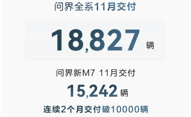 其中問(wèn)界11月交付新車18,827輛,問(wèn)界新M7交付1,5242輛,上市以來(lái)該車?yán)塾?jì)交付27,000輛,而截至日前大定量已超10萬(wàn)輛。