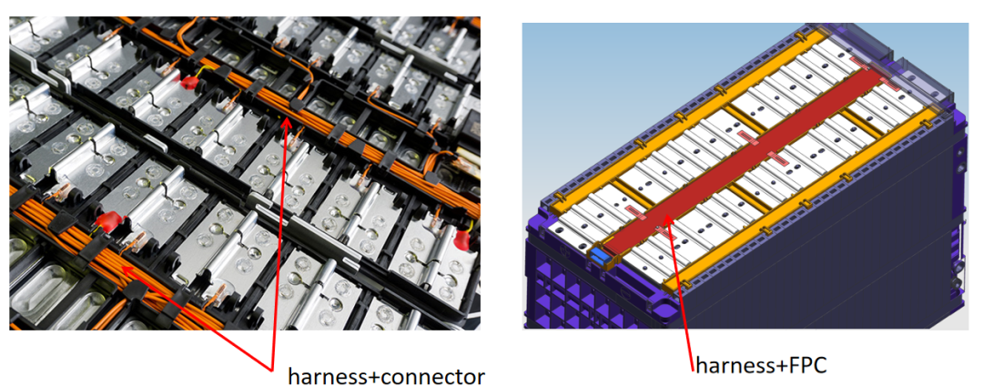 對于動力電池而言,一般是由Pack -module- cell 構(gòu)成,動力電池一般是通過BMS來實現(xiàn)控制,多個電芯構(gòu)成了模組,而模組就需要對電芯的電壓和溫度等實現(xiàn)監(jiān)控,傳統(tǒng)都是通過模組采樣線束組件來實現(xiàn),隨著技術(shù)的發(fā)展,為滿足新型電動汽車大規(guī)模生產(chǎn)對高效化、自動化的要求,采用集成總線,減少人工裝配和布線錯誤,滿足汽車生產(chǎn)高度自動化的要求,實現(xiàn)電壓采集、電池保護和電池之間的電力傳輸,目前各家都采用了FPC+Connector 的形式替代了傳統(tǒng)采樣線束組件,而且FPC還可以監(jiān)控充電過程。