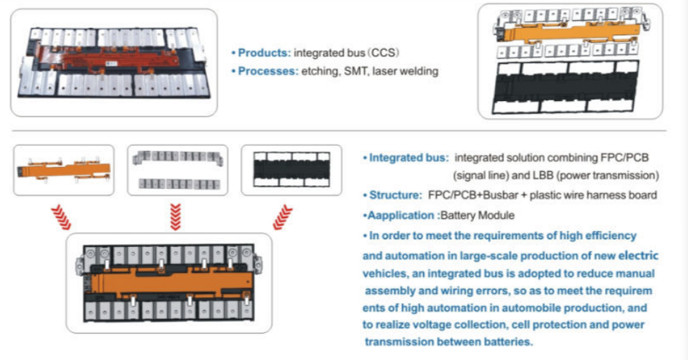 目前 FPC 方案已經(jīng)成為絕大部分新能源汽車新車型的最主要選擇。FPC 向 CCS(Cells Contact System,集成母排,線束板集成件)集成。CCS 產(chǎn)品由 FPC、塑膠結(jié)構(gòu)件、銅鋁排等組成,銅鋁排將多個電芯通過激光焊接進行串并聯(lián),F(xiàn)PC 通過與銅鋁排、塑膠結(jié)構(gòu)件連接從而構(gòu)成電氣連接與信號檢測結(jié)構(gòu)部件。