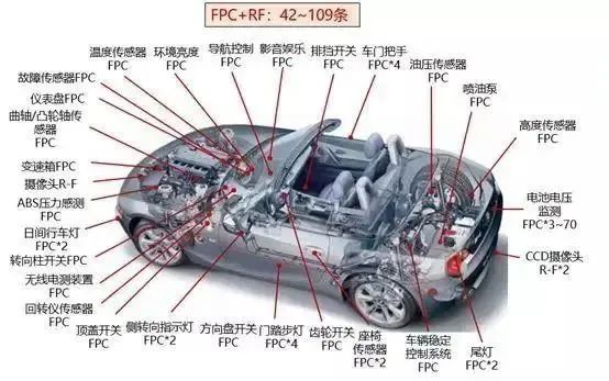 對于汽車FPC而言,無論是燃油車輛,還是智能車輛都有大量的FPC的應(yīng)用,主要存在于汽車電子板塊,汽車電子是汽車電子控制裝置和汽車電子控制裝置的總稱。主要包括發(fā)動機控制系統(tǒng)、底盤控制系統(tǒng)和汽車電子控制系統(tǒng);而從結(jié)構(gòu)、空間等考慮,未來新能源汽肯定會大量采用FPC代替線束,會在車輛多個部位應(yīng)用實現(xiàn),所以FPC技術(shù)在汽車電子,尤其智能汽車上是一個非常重要的趨勢,尤其在電池BMS、車輛照明系統(tǒng)、門控系統(tǒng)、攝像頭模組等;