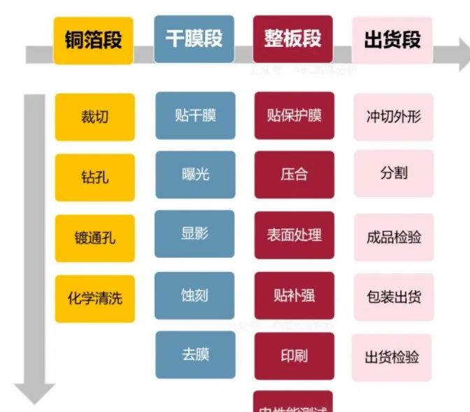 雙面板:開料→ 烘烤→ 鉆孔→ 黑孔 → VCP→ 前處理→ 貼干膜 →曝光→ 顯影 → 蝕刻 → 脫膜 → 前處理→ 貼覆蓋膜 → 壓合 → 固化→ 表面處理→ 電測(cè)→ 裝配 → 壓合 → 固化→ 文字 →外形→ 終檢→包裝 出貨。