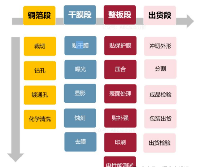 雙面板:開料→ 烘烤→ 鉆孔→ 黑孔 → VCP→ 前處理→ 貼干膜 →曝光→ 顯影 → 蝕刻 → 脫膜 → 前處理→ 貼覆蓋膜 → 壓合 → 固化→ 表面處理→ 電測→ 裝配 → 壓合 → 固化→ 文字 →外形→ 終檢→包裝 出貨