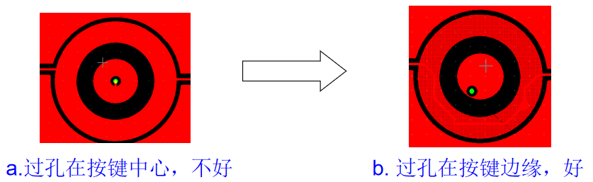 按鍵中心的過孔要移至邊緣,不能在按鍵的中心,避免按鍵在使用中接觸不良。按鍵分圓形按鍵和橢圓形按鍵兩種,DOME片大小有3、4、5和3×3、3×4、4×5幾種,F(xiàn)PC的鍵盤單邊比dome片大0.3mm,F(xiàn)PC上的按鍵至少為3.6、4.6、5.6和3.6×3.6、3.6×4.6、4.6×5.6,若大小不夠,要做相應補償。