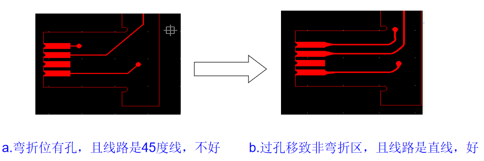 彎折區(qū)域的過孔要移到非彎折區(qū)域,以免彎折過程中孔破;彎折區(qū)域的線路以直線最佳,并把線路盡量加粗。