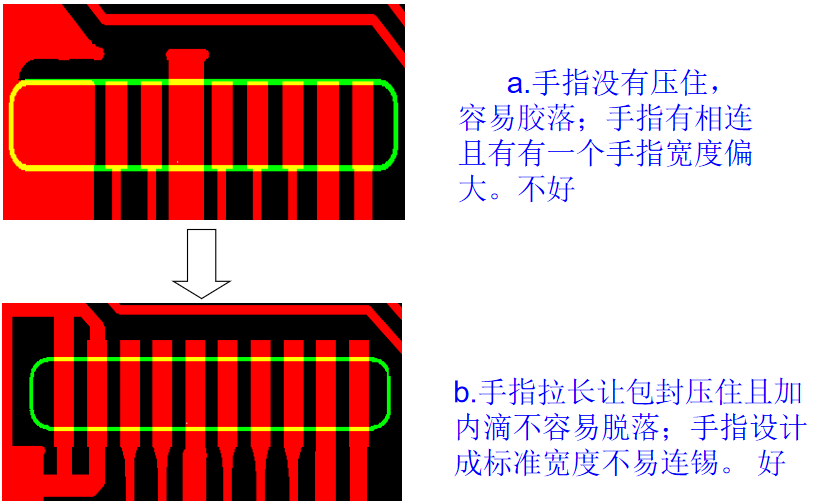 主鍵的連接器在允許的條件下,單邊拉長0.2mm,讓包封壓住,且相連手指盡量修改成包封開窗外連接,接地手指做成和標準手指一樣大,以免連錫,影響SMT質量。