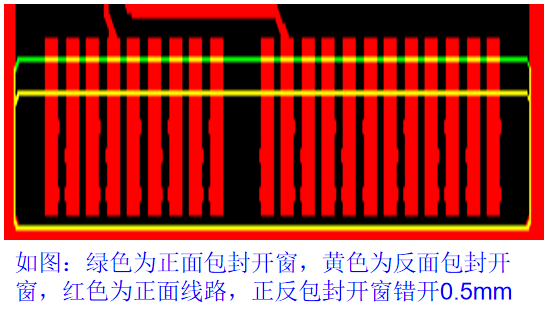 焊盤與焊盤有線的,盡量不要開通窗(特殊情況除外),以免造成連錫,影響SMT質量(如下圖綠色為包封開窗)。