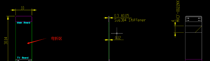可以隨意彎折是FPC軟板的最大優(yōu)勢,因此它的彎折區(qū)要特別關注下,這是一個FPC項目中結構工程師給出的一個三視圖圖紙,這是一個副板連接主板的FPC排線,中間部分就是需要彎折的地方。
