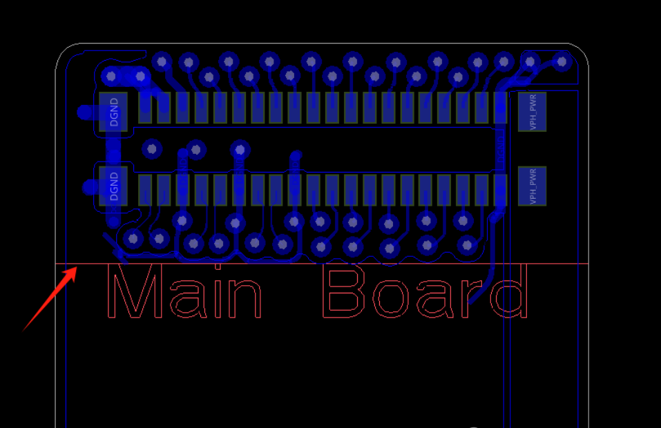 FPC設計中,對彎折區(qū)的要求很高,第一點就是彎折區(qū)內不能打孔,打孔會使彎折區(qū)銅硬度變大,影響彎折的效果和降低FPC壽命。如下圖所示,箭頭所指線以下為彎折區(qū),BTB連接器的換層走線孔必須避開彎折區(qū),不能在彎折區(qū)打孔。