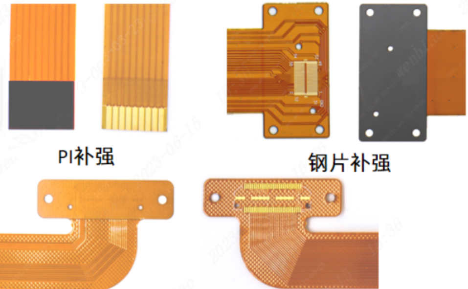 軟板廠FPC補強的材質一般有PI、FR4和鋼片3種,如下圖所示,補強區(qū)一般在金手指、按鍵或連接器的背面,對補強區(qū)的要求就是不能放置元器件和絲印文字等,比如絲印文字,補強后文字就被遮擋了。