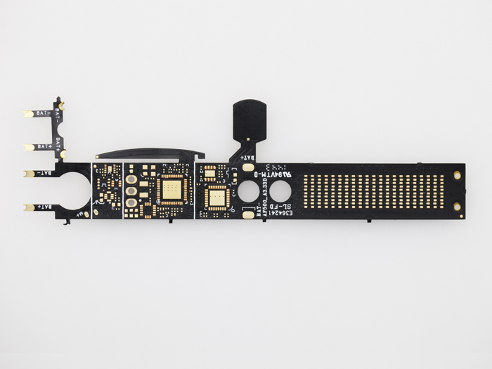 型 號(hào):RM01C00187A層 數(shù):1板 厚:0.12mm材 料:單面有膠電解銅 厚:1/2 OZ表面處理:沉金2微英寸最小線寬/線距:0.1mm/0.08mm特 點(diǎn):外形復(fù)雜